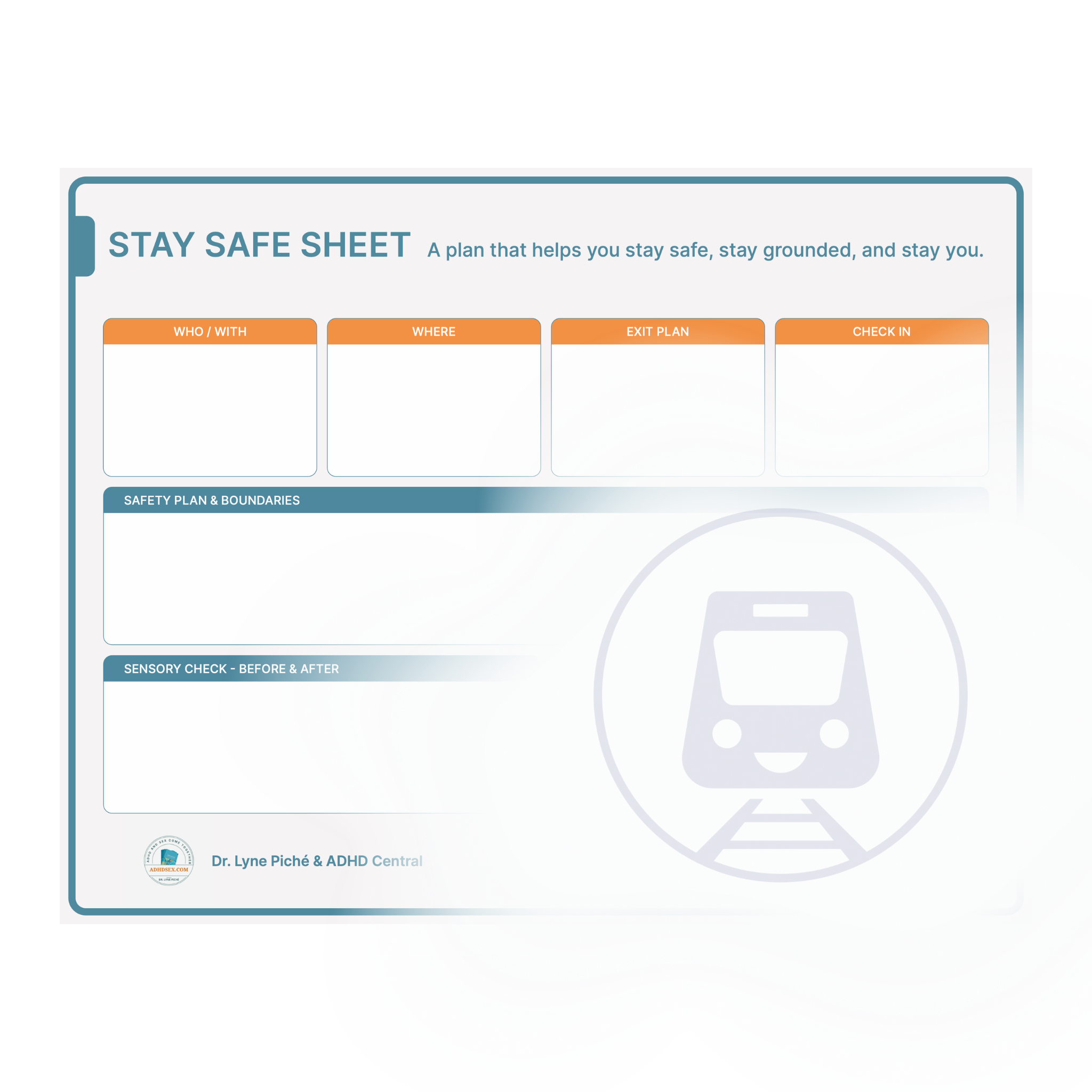 The Stay Safe Sheet is a gentle, practical tool to help you plan ahead for connection, intimacy, or emotionally charged moments. Created in collaboration with Dr. Lyne Piché, this printable PDF supports ADHD brains in slowing down, checking in, and making choices that feel safe and aligned.